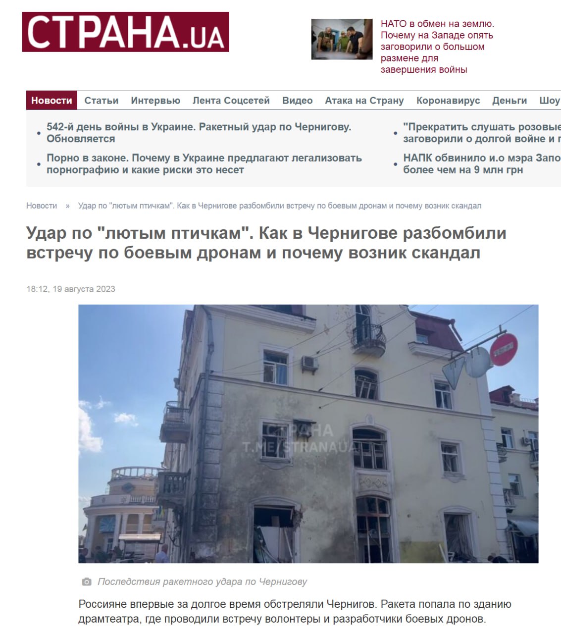 "Россияне впервые за долгое время обстреляли Чернигов. Ракета попала по зданию драмтеатра, где проводили встречу волонтеры и разработчики боевых дронов".